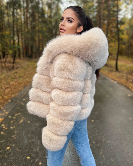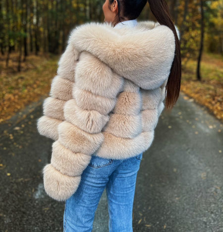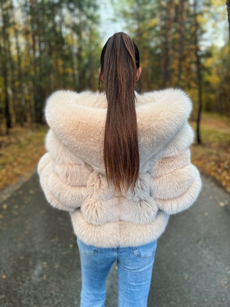 Luksusowe beżowe futerko z kapturem, wykonane z najwyższej jakości skór lisów fińskich pochodzących z renomowanego domu aukcyjnego Saga Furs. Nasze skóry to gwarancja wyjątkowej klasy, co widać w każdym detalu – od perfekcyjnego wykonania po niepowtarzalną miękkość i elegancję.