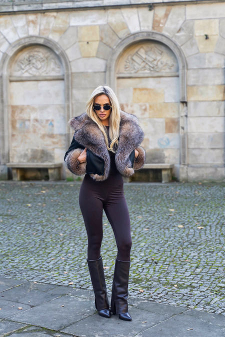Ekskluzywny krótki kożuszek wykonany z najwyższej jakości włoskiej skóry jagnięcej w eleganckim czarnym kolorze. Skóra jest wyjątkowo miękka i delikatna, co gwarantuje komfort noszenia i luksusowy wygląd. Model wyróżnia się bogatym obszyciem z lisa kryształowego – zarówno na efektownym kołnierzu, jak i przy mankietach, co dodaje całości szyku i prestiżu.